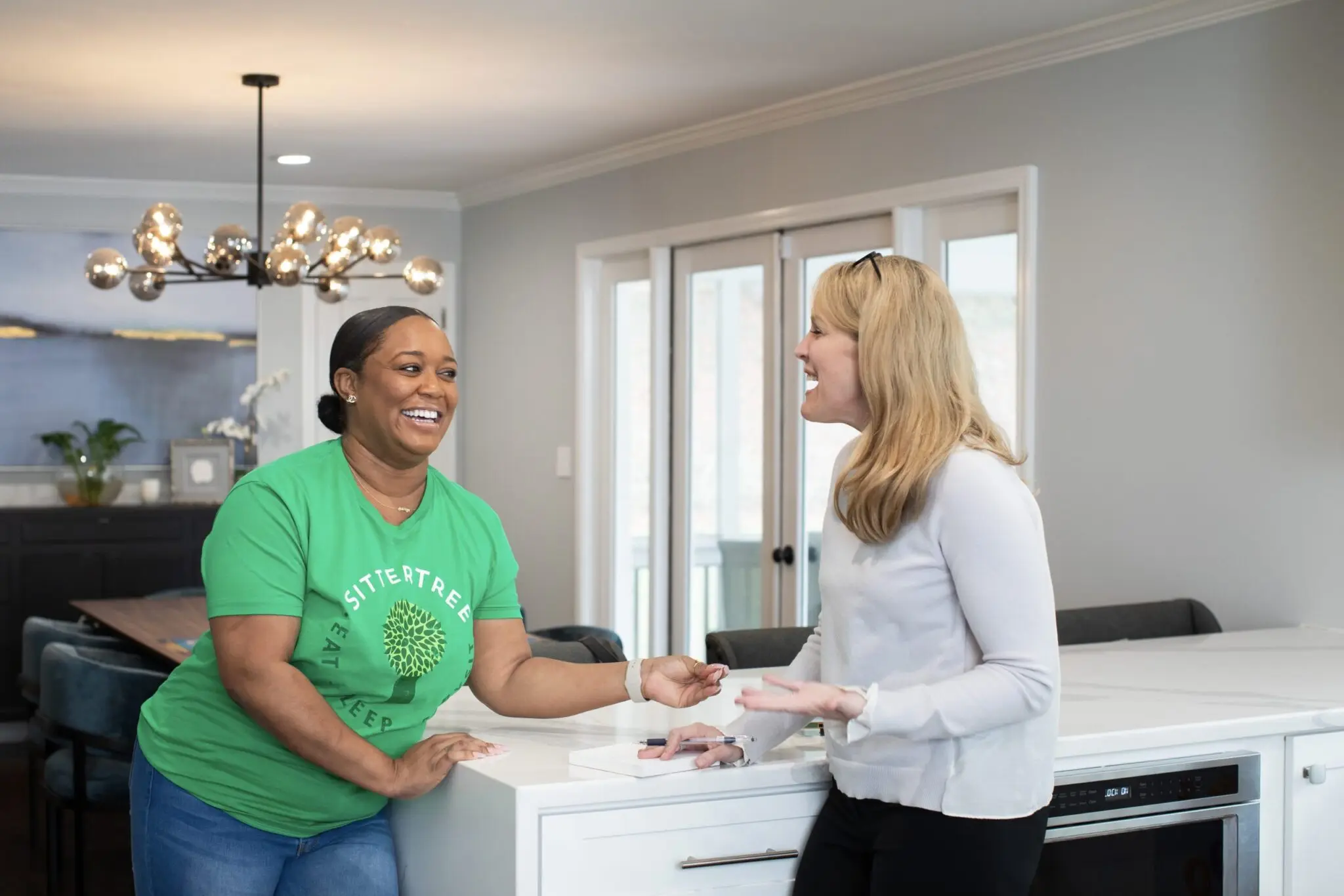 Tips for Screening Your Babysitter: A smiling SitterTree sitter chats with a mom holding her young child in a cozy kitchen. The child holds a stuffed animal and a notebook, creating a warm, friendly moment between the sitter and family.